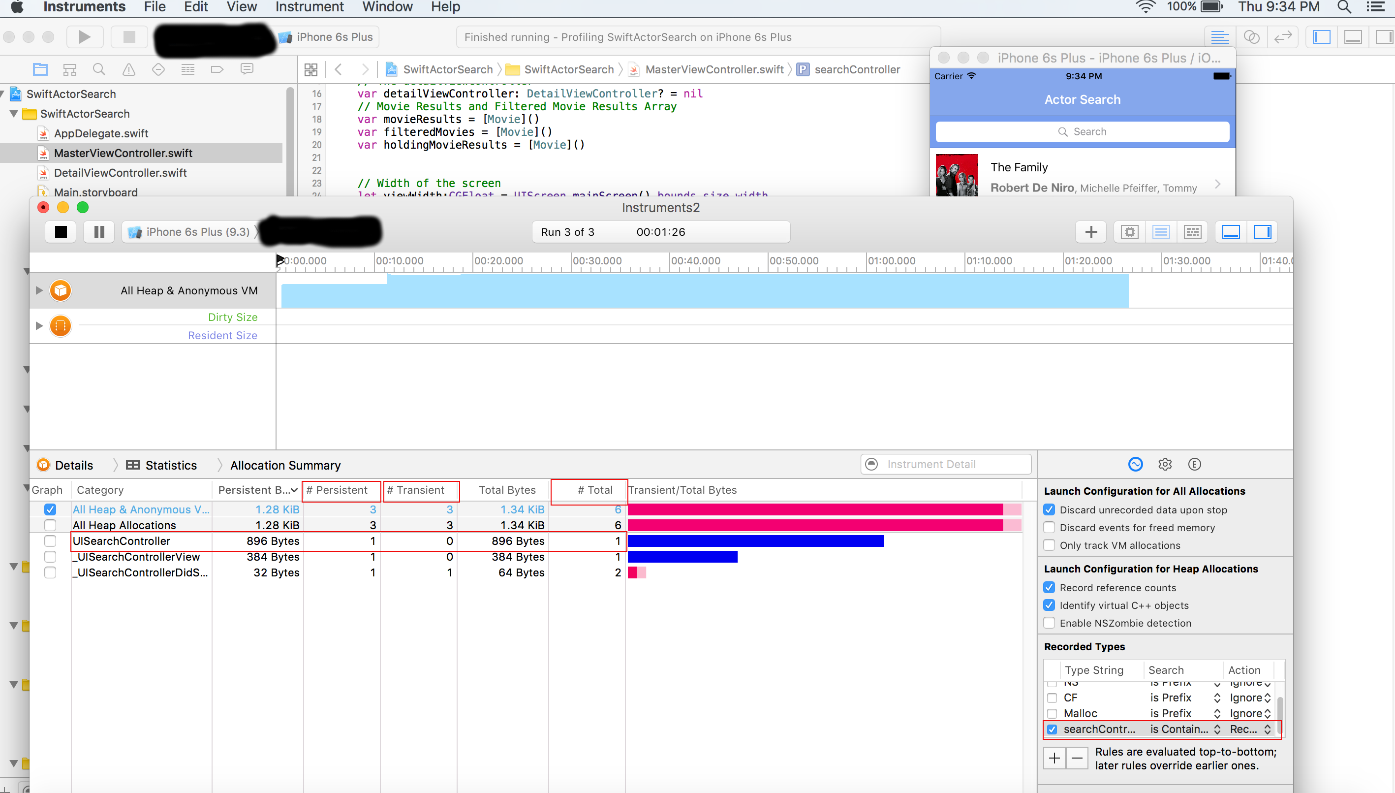 Using Swift and Storyboards seems to be the de-facto way that most develop projects these days. There is certainly nothing wrong with this method, but using Swift and Storyboards certainly can came with unexpected memory spikes that you were unprepared for. It has been my experience that singling out Swift objects to profile in some cases can not work as consistently as it does with Objective-C. As for Storyboards, I have seen Storyboards use memory differently than you would expect than if you developing the same layout programmatically. For this reason when I am developing a project in Swift that uses Storyboards I tend profile memory on a ViewController by ViewController basis during my development process just to make sure that I can capture anything that may have spiked the memory in my Storyboard or so I can be sure that I can capture all of my Swift objects that I need to profile.